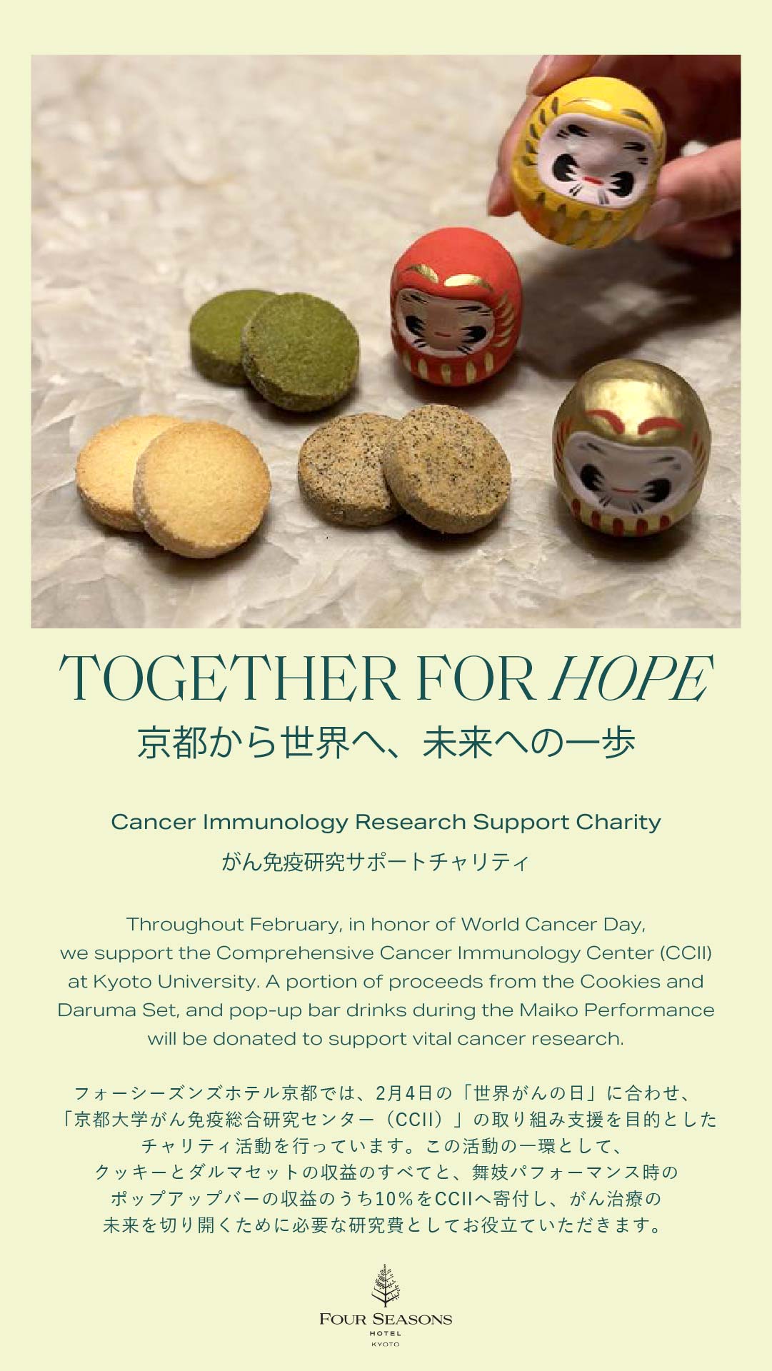 フォーシーズンズホテル京都では、「世界がんの日」にあわせてチャリティー活動を展開します。ホテルでのチャリティークッキーの売り上げのすべてと、レストランの売り上げの一部をCCIIでの研究支援のためにご寄付いただくというものです。